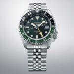 Seiko GMT Sport 42mm automatic watch with green dial and black bezel, designed for men. Reliable dual-time performance with a sporty design.